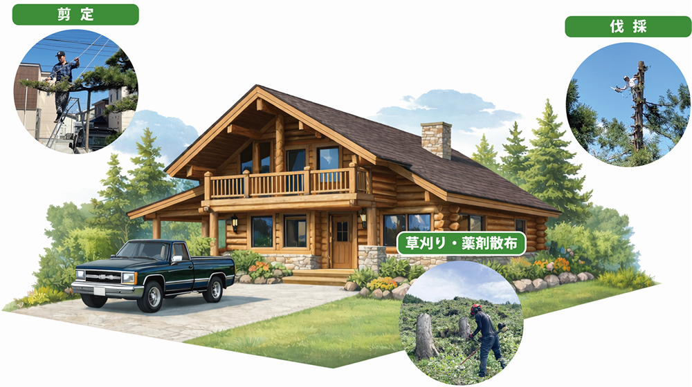 倒木の危険や景観への影響など、木にまつわるさまざまな課題に向き合い、特殊伐採や森林整備を通じて安全で安心できる環境づくりに取り組んでいます。